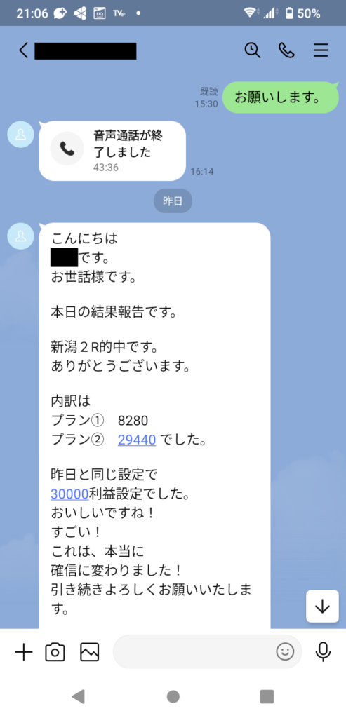 さらに、毎週のようにお電話やZOOMで連絡を取り合い、マイナス収支が出たときの対策や低リスクで収益を伸ばす秘訣まで、綿密にサポートしています。土日のレース後には結果報告もいただき、毎回感謝の言葉をたくさんいただけており、その方の真摯な姿勢が成果に表れています。