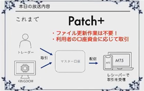おさらいになりますが、これまでのPatch+は、トレーダーさんのミラートレードとキングダムの自動取引がマスター口座で運用され、