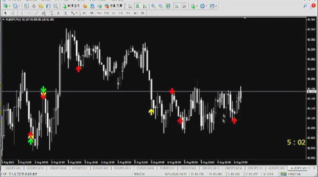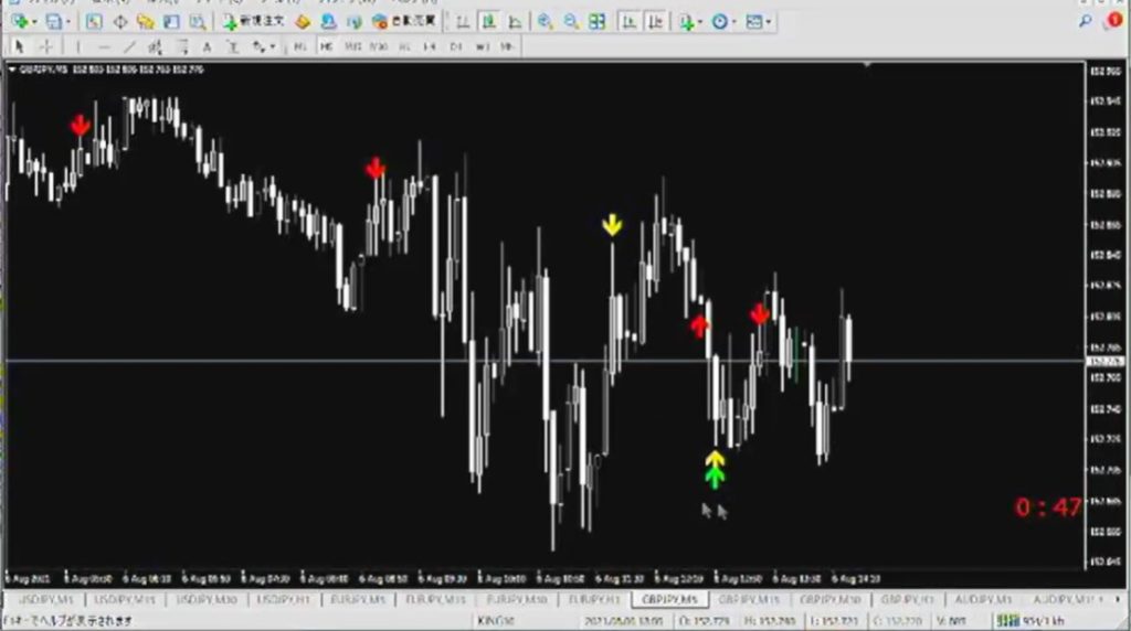 この画面でいうと↓矢印がでているのでsell、つまり下方向にエントリーすると勝てる確率がとても高くなります。基本は5分足が基準になります。