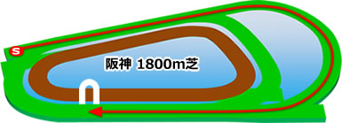 阪神競馬場の芝1800mコースは、内側に設置されたレールを外回りに曲がりながらスタートし、長い直線が続くコースです。スタート地点から約400mの位置まではやや上り坂が続き、その後はほぼ平坦なコースとなっています。また、コース幅が広く、バランスの良いレース展開が求められます。